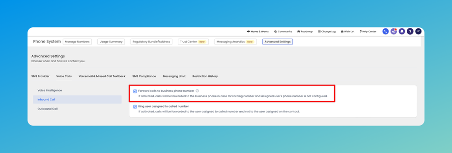 You can see this option under Settings > Phone Numbers > Advanced Settings > Voice Calls > Inbound Call