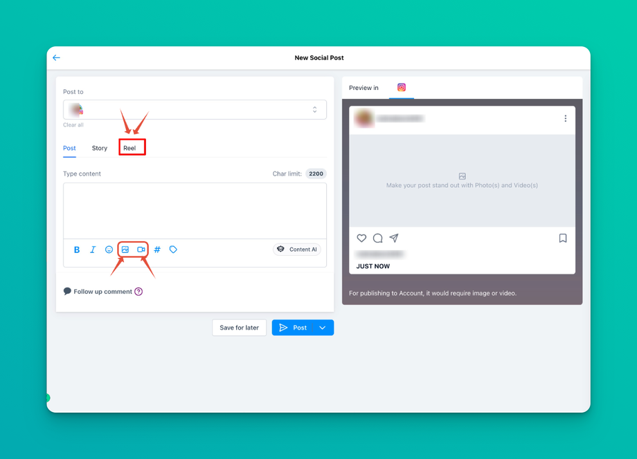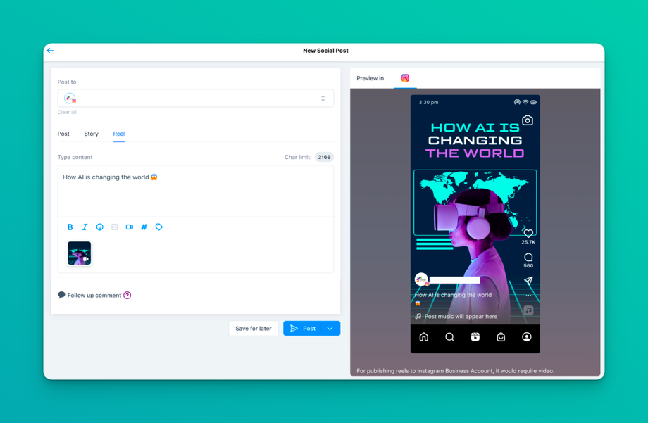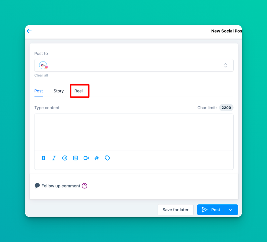 If you select another social account, Reels will not be visible. For publishing to Instagram, you must select one or multiple Instagram Professional accounts.