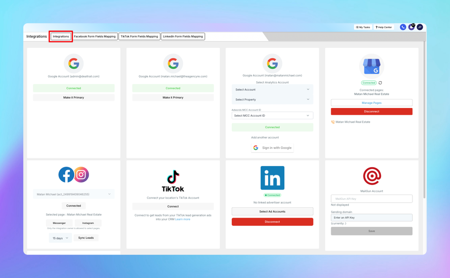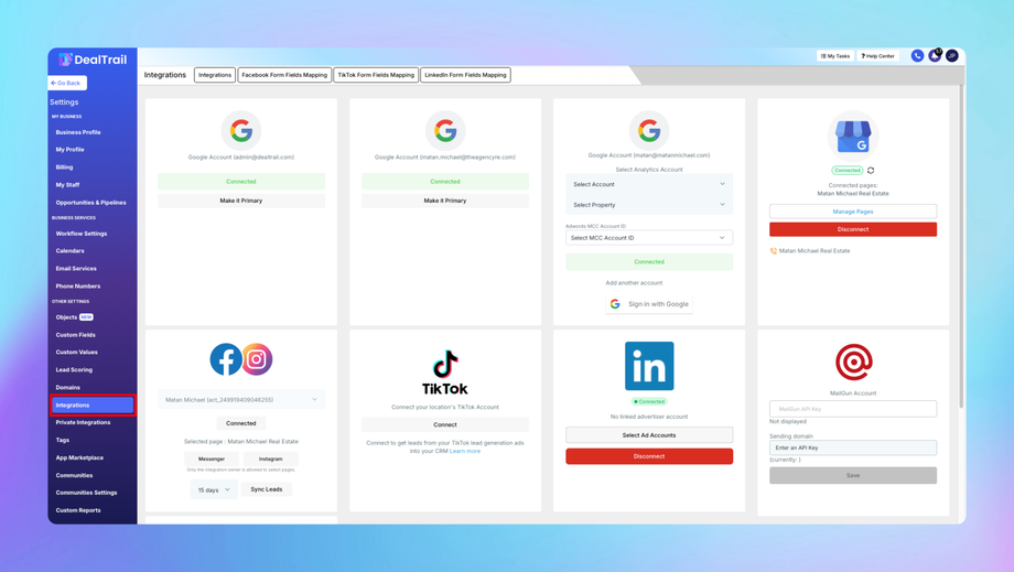The Integrations section in DealTrail allows you to connect third-party platforms and map form fields to streamline lead collection and management. This guide covers the following areas under Settings > Integrations.
