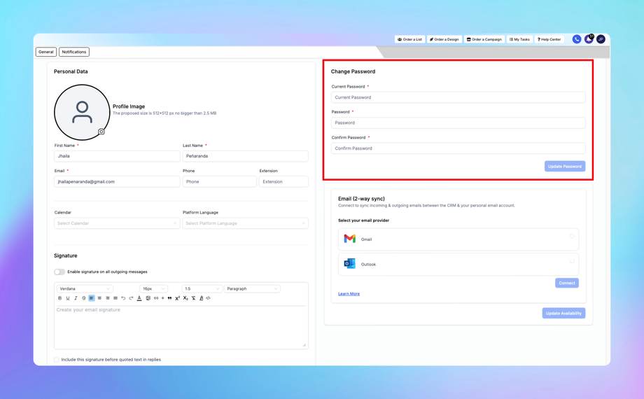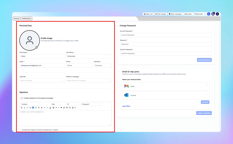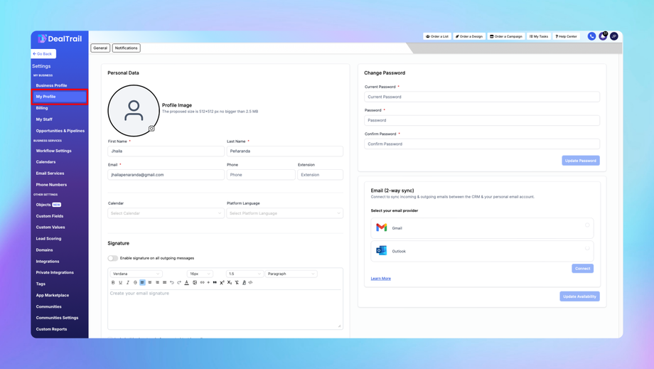The My Profile section in DealTrail allows users to manage their personal account details, preferences, and security settings. This ensures accurate communication, seamless operation, and enhanced account security.