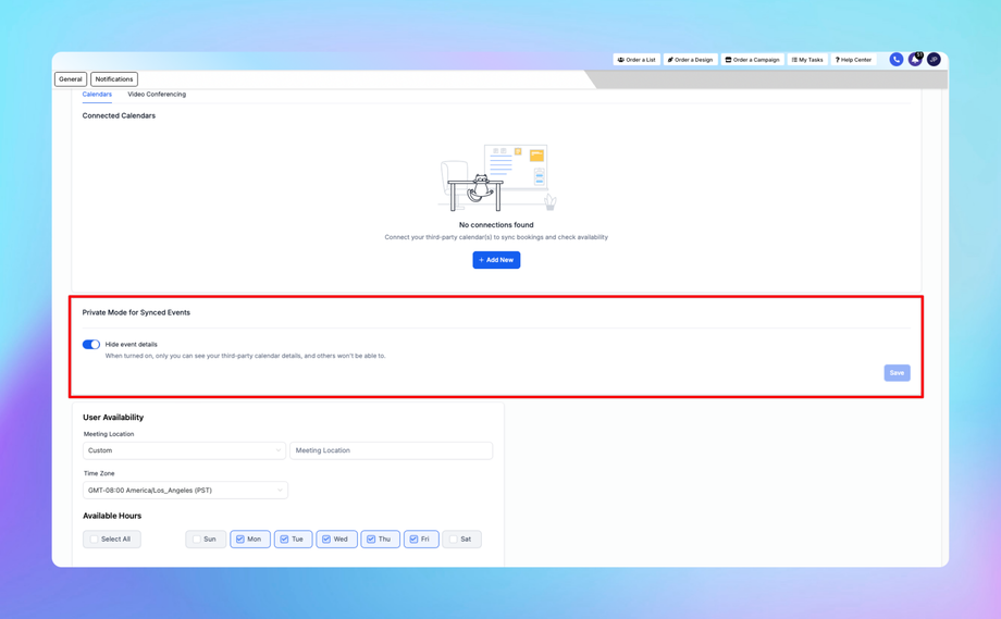 • Toggle the Hide event details option to ensure only you can view details of synced events from your third-party calendar. Others will see the time as blocked but without details.