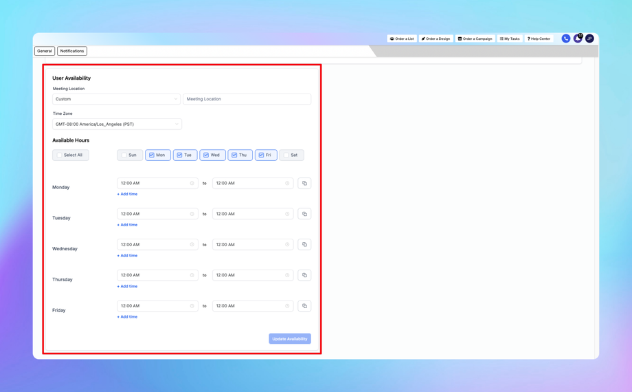 • Time Zone: Set your preferred time zone to ensure accurate scheduling.