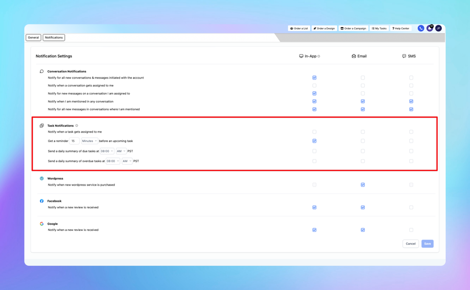 • Check the corresponding box under In-App, Email, or SMS for each type of notification.