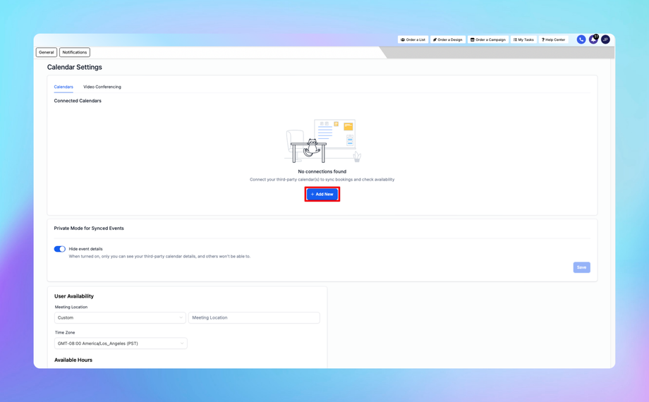 The Calendar Settings section allows you to manage your calendar integrations, privacy settings, and user availability to ensure seamless scheduling and organization within the platform.