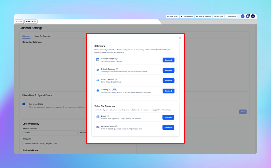 • Displays a list of third-party calendars connected to the platform (e.g., Google Calendar, Outlook).