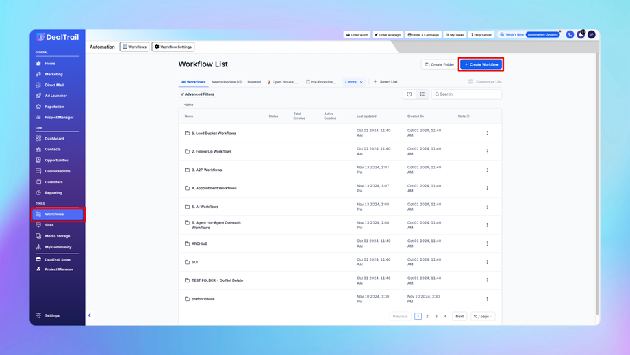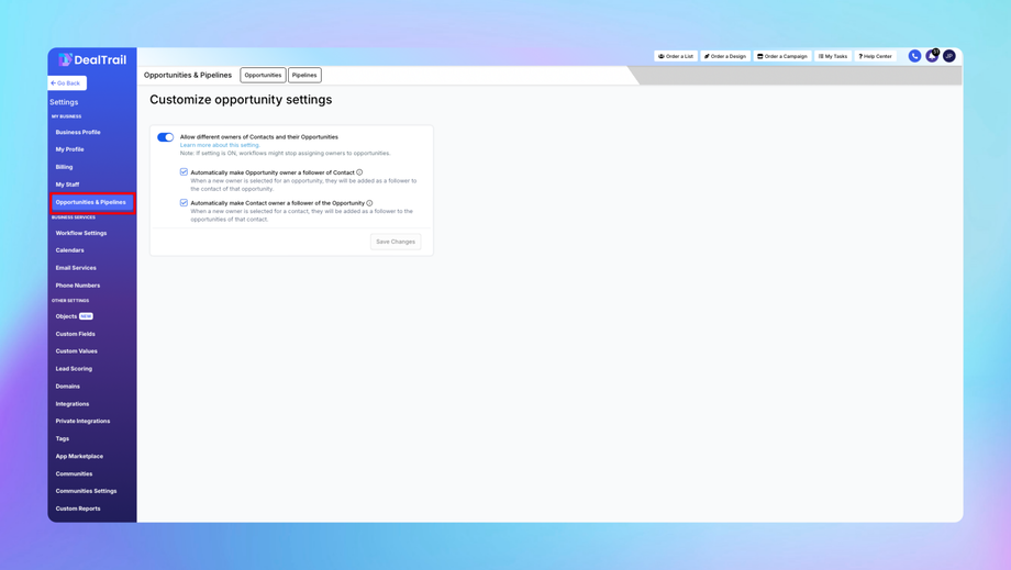 The Opportunities & Pipelines section in DealTrail helps you track and manage sales and customer interactions through a visual workflow. Pipelines organize the stages of your sales or service processes, while Opportunities represent individual leads or deals.