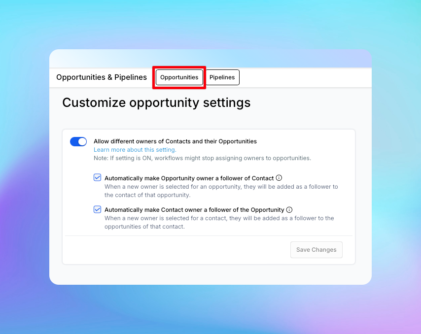 • Navigate to Settings > Opportunities & Pipelines > Opportunities.