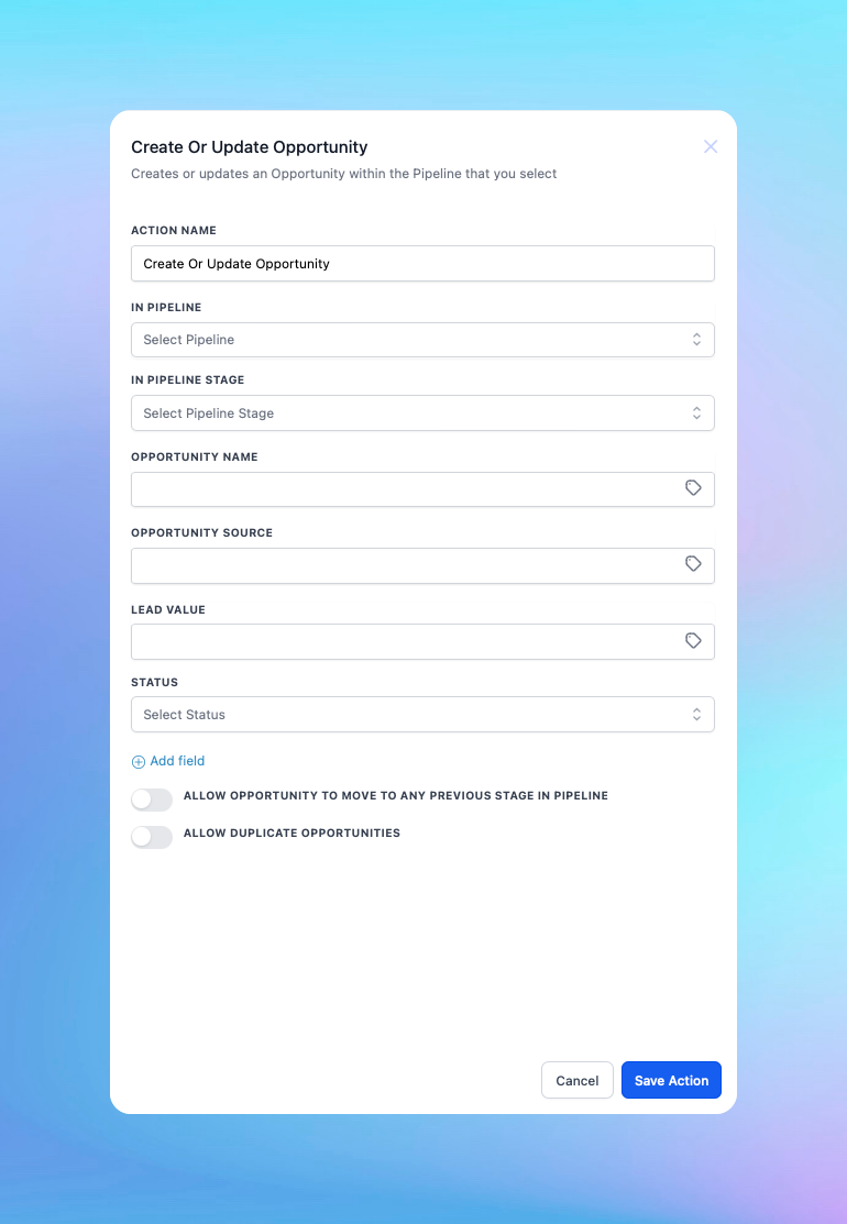 • Create Opportunity: Automatically add an opportunity to a specific pipeline and stage.