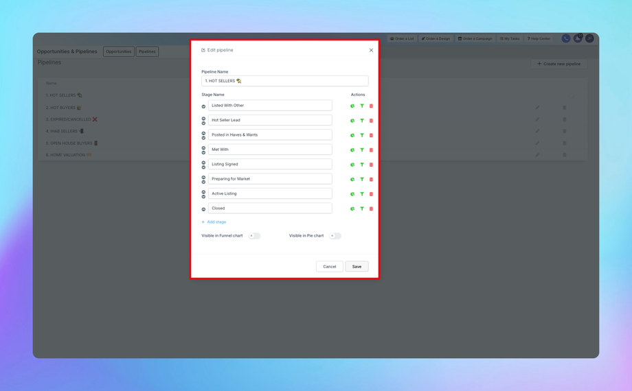 2. Adjust stage names, add/remove stages, or reorder them using drag-and-drop functionality.