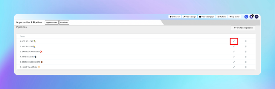1. Under Settings > Opportunities & Pipelines, select the pipeline you want to edit and click edit button.
