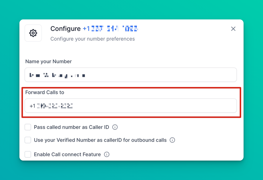 The phone number to which inbound calls are made to this new number should route (when someone calls the new number we just purchased, the call will be redirected to whatever number we save here).