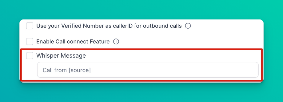 The Whisper Message controls the message played to the person who answers the call when the Call-Connect features are enabled. So we would put something like “DealTrail call” or “Call from your agency name, press a key” so that you know you’re about to hop on a call from the system and that you need to press a key to connect.