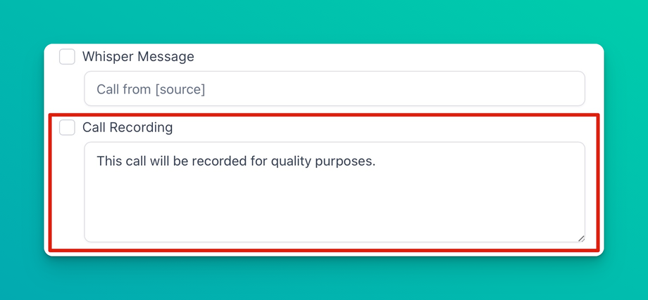 The ability to turn on call recording is incredibly powerful as we will not only record the calls, but we will also publish the recording right into the conversation stream of each contact, along with all the emails, text messages, Facebook messages, Instagram DMs, and more! If you turn this on, please be aware that most states require that you enter a whisper message here, like “this call will be recorded for quality purposes,” so that the caller is aware.