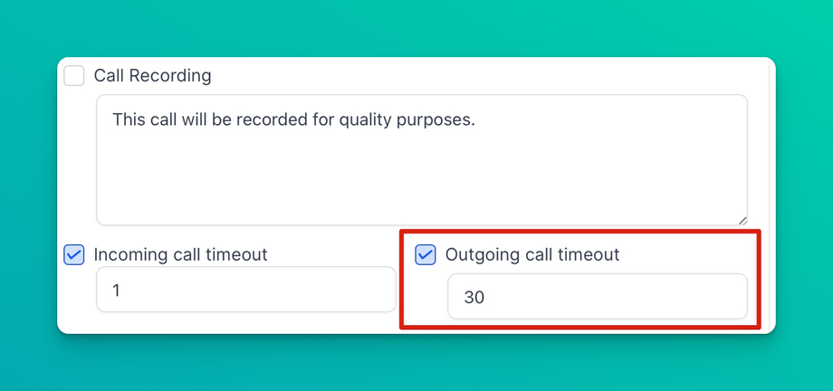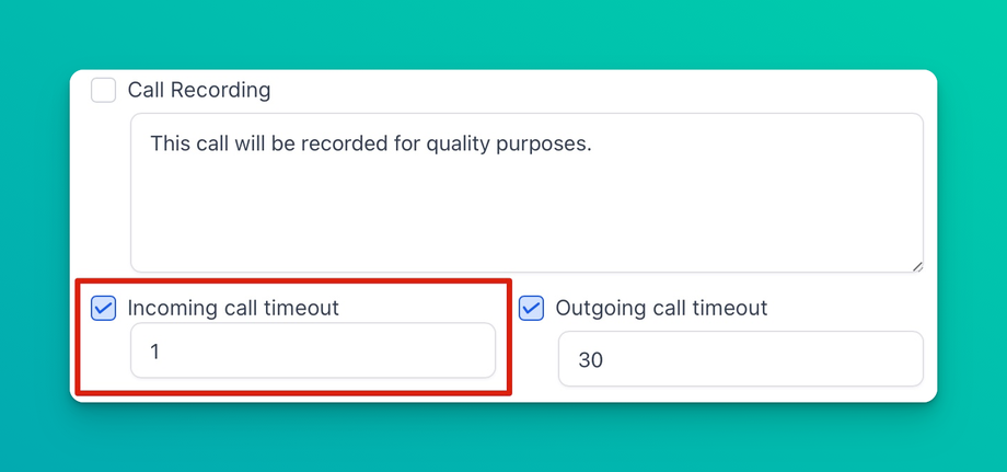 If you want the line to ring and the lead to reach a pre-recorded voicemail set within the CRM, add the inbound call timeout to around 20+/- seconds. Setting a short timeout will ensure the line doesn't ring long enough to reach your personal voicemail recording