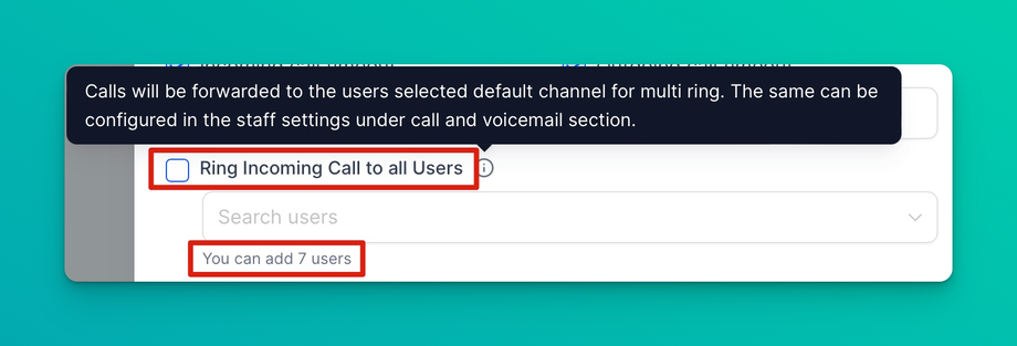 This feature allows you to pass incoming calls to users (team members) in your account. When you get a phone call, the phone of every user you select here will ring until someone picks up the call or the timeout has occurred. You can select up to 7 users to receive incoming phone calls, which increases the likelihood of calls being answered by your team even if a few team members are unavailable at the time of the incoming call. More information on this option in this support article: Ring Incoming call to multiple users.