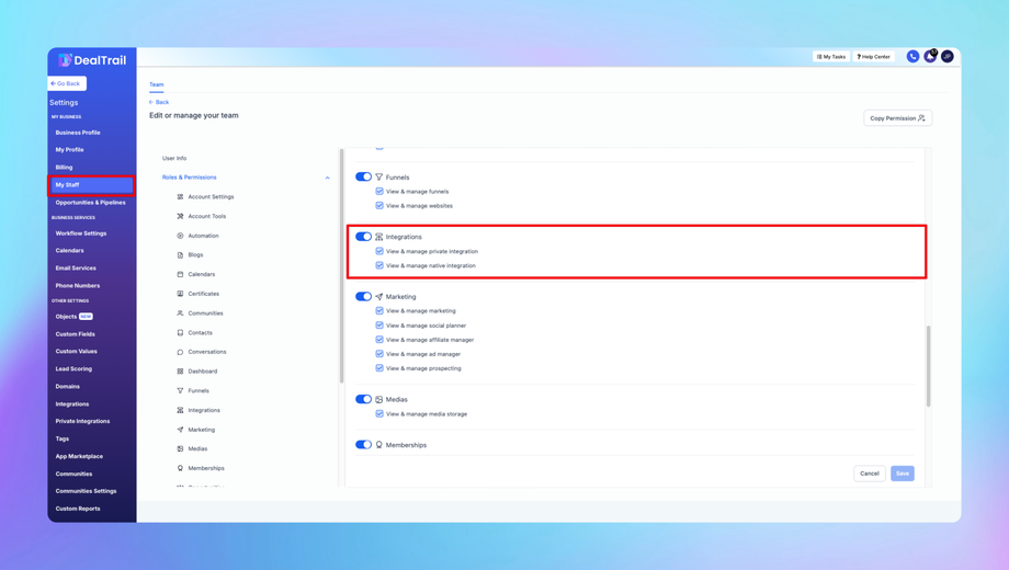 However, you can restrict this permission at a user level. To do this, Navigate to Settings > Team > Edit the specific agency admin > Roles & Permissions, and enable/disable Private Integrations for the agency admin.