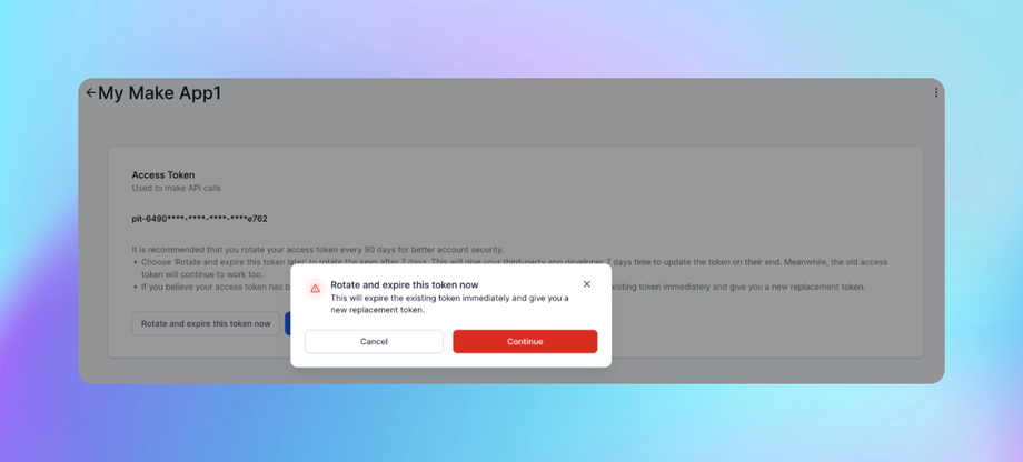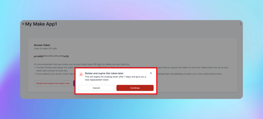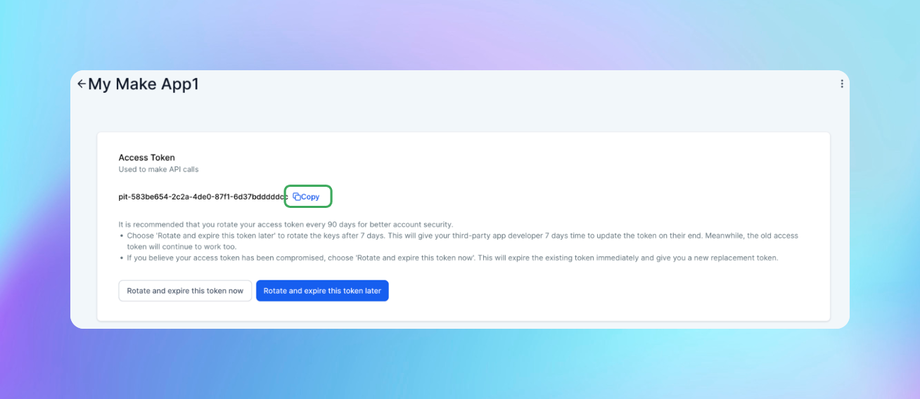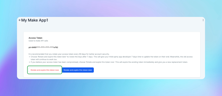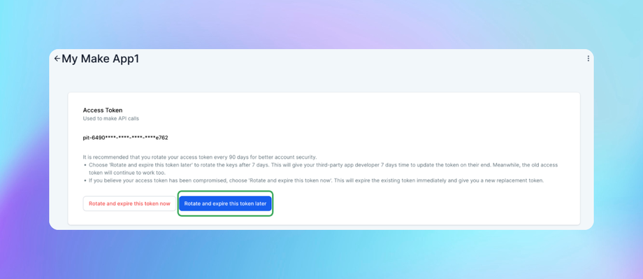 Step 4: Copy the new token and update it on your third-party app. You will have a 7 day window where both the old and the new tokens will continue to work. After 7 days, the old token will expire. In this 7 day window, you will have the option to: