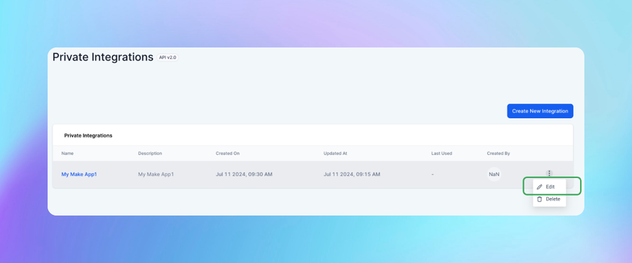Step 1: Navigate to Private Integrations under settings, and select "Edit" from the three-dot menu.