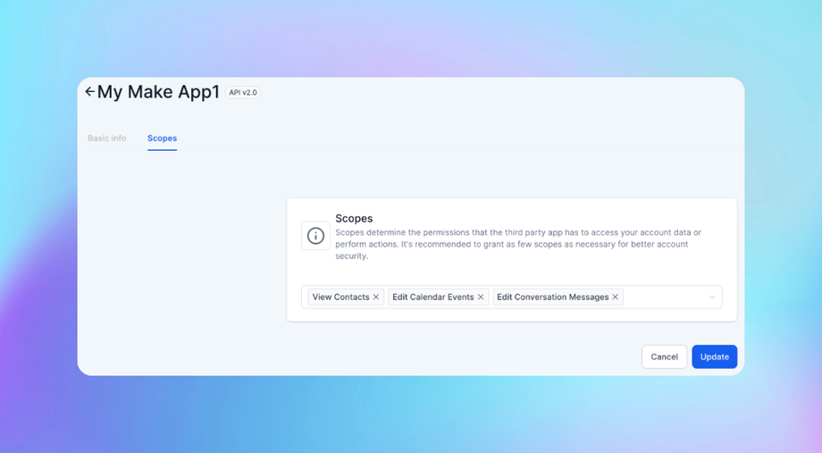 Step 3: If required, update the scopes/permissions that you want the private integration to have access to on your account. Ensure that you are selecting only the required scopes for better data security. Click on "Update" to save the updates made.