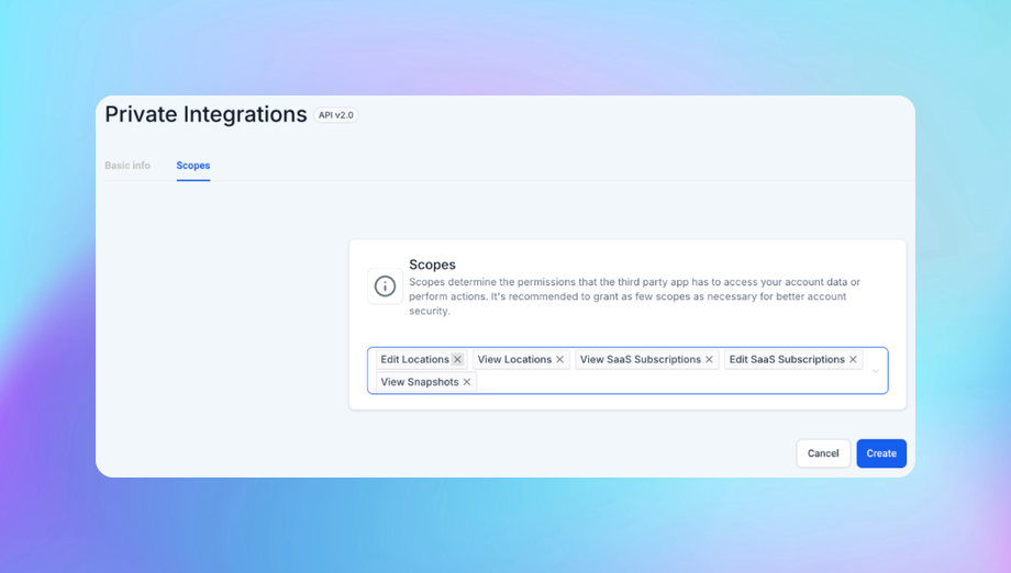 Step 3: Select the scopes/permissions that you want the private integration to have access to on your agency account. Ensure that you are selecting only the required scopes for better data security.