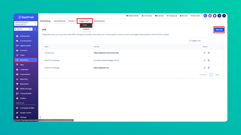 Click on 1. Marketing > 2. Trigger links > 3. Add Link