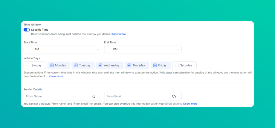 One such setting is the Time Window, which can be set to 'Any Time' or 'Specific Time.' For instance, when dealing with clients across various time zones, 'Specific Time' ensures messages are sent when most likely to be read.