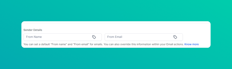 Email: You can set a default from name and email address for your emails, although this can be changed by specifying from name and email in the email actions.