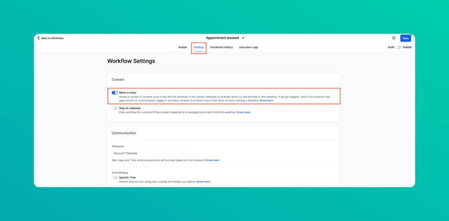 Please Note: Workflows that utilize an appointment or invoice-based input trigger will permit contacts to enter multiple times, irrespective of the state of the "Allow Re-Entry" setting. Even if "Allow Re-Entry" is not activated, these specific input triggers will override the setting and Allow Re-Entry entries of the same contact after they have gone through the workflow or been removed from it.