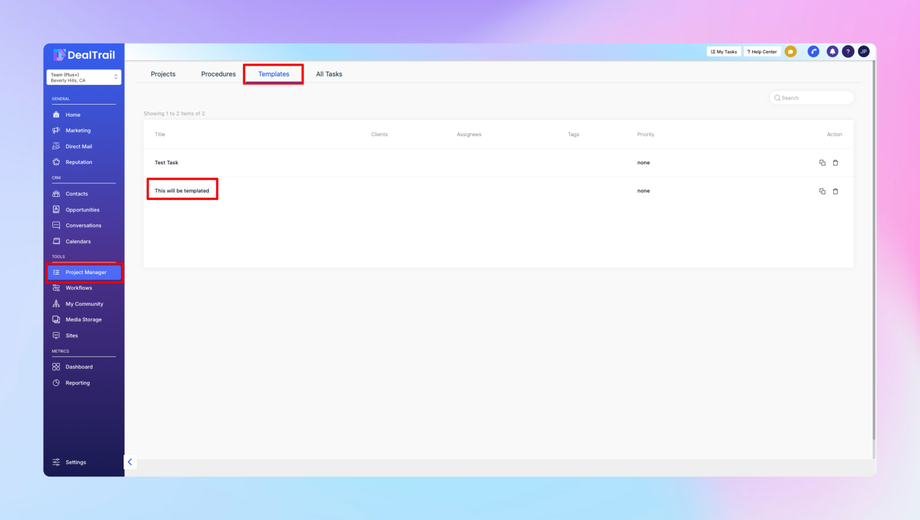 Templates in DealTrail’s task management system help streamline repetitive task creation, ensuring you don’t need to start from scratch each time. By saving tasks as templates, you can replicate them across projects with ease, maintaining consistency and saving time.